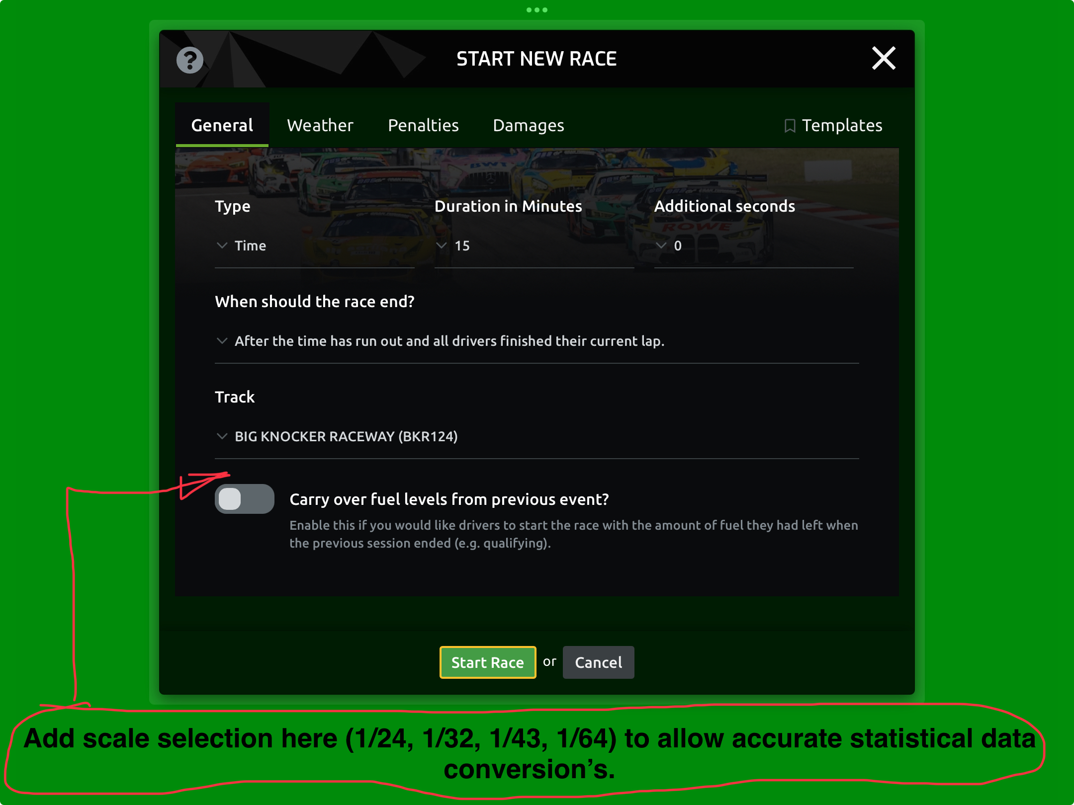 SmartRace automatically calculates speed based upon track length and scale of car being raced. However, the "MILES" shown on the statistics TAB indicates FULL SCALE mileage.Example: 1 mile currently shown on the statistics page would actually be 24 miles for 1/24, 32 miles for 1/32, 43 miles for 1/43, 64 miles for 1/64. My suggestion is to add a "RACING SCALE" selection (1/24, 1/32, 1/43, 1/64) on the "General Tab of the "RACE" set up page to allow SmartRace to convert distance into the racing scale equivalent. This would allow all data being shown on the statistics page and within SmartRace to be representative of the scale being raced.