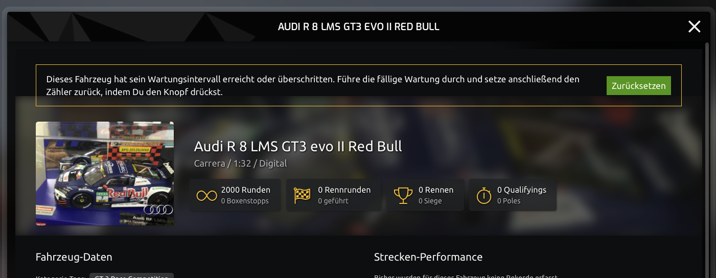 Im Bildschirm "Fahrzeugdaten" wird der "Wartungsintervall" und die "Runden seit Wartung" angezeigt.