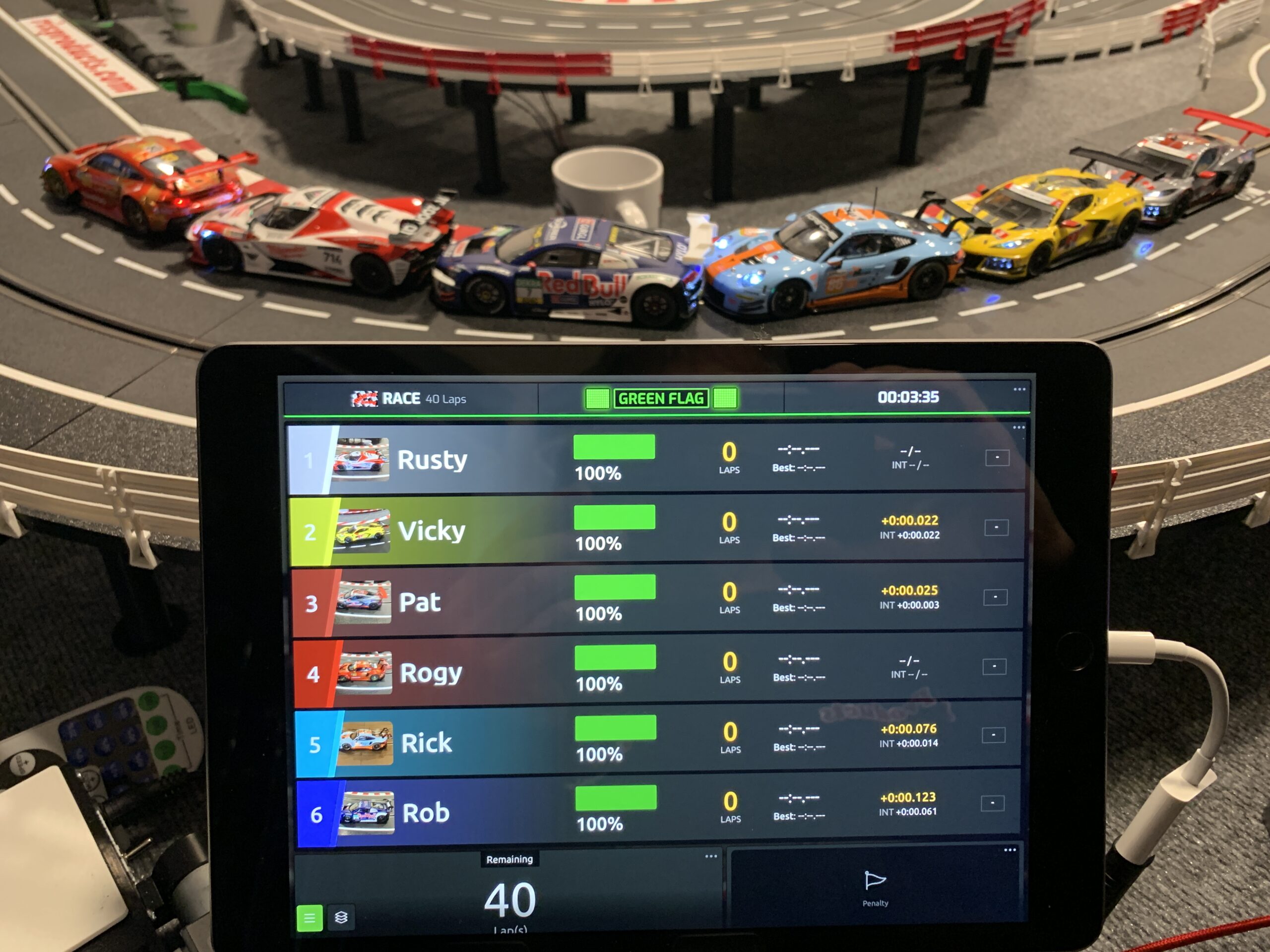 Working on my race videos this week I discovered an issue on the first lap of a race. The order of the cars does not match the order shown on the race screen as they cross the S/F line on the first lap. We start our races in single file so all the cars cross the S/F line in the correct starting order. But the race screen puts the cars in some random order that does not match the actual order of the cars. I tested this by lining up 6 cars behind the S/F line and then starting a race. I just use my hand and push all 6 cars across the S/F line. If I go slow I can see each car show up on the race screen in the correct order but as other cars cross the S/F line the order is suffled or randomized into some other order. The order remains wrong until the cars cross the S/F line the next time where it then puts them in the correct order as they cross the line. I have a photo attached that shows 6 cars in the background that just crossed the S/F line but you can also see on the race screen the cars are in a different order. Is there some reason for this or is it one of those bugs? :-) Rick