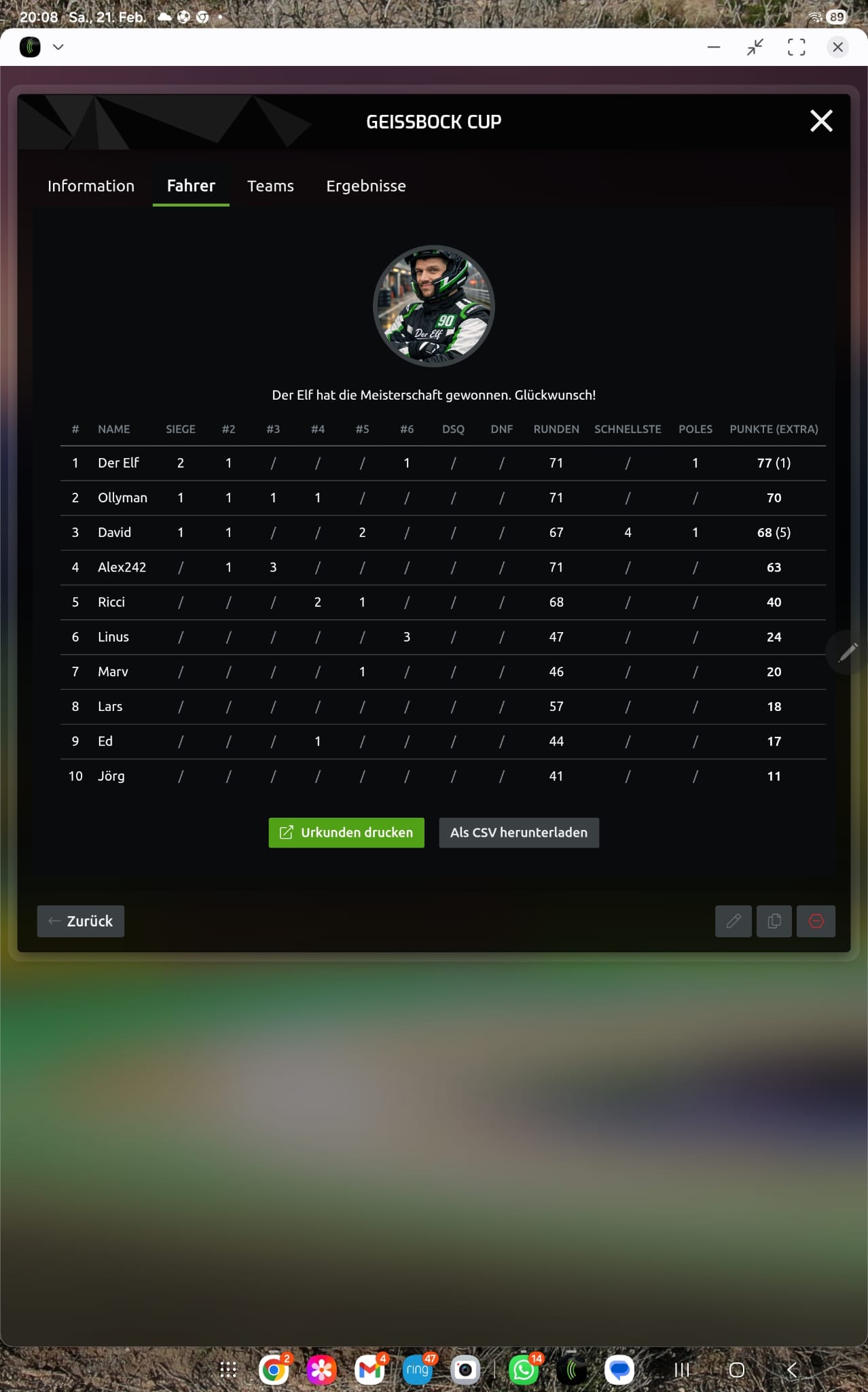 Final reault table of a championship only shows positions up to #6 place. When racing with 10 drivers the positions #7 to #10 are not shown. However, the calculations are right. Please enable the missing positions to be shown in the final table...this will increase fun and encourage drivers to get better. Nevertheless a championship deserves a full report with all positions and respective points. Carrera Hybrid mode used